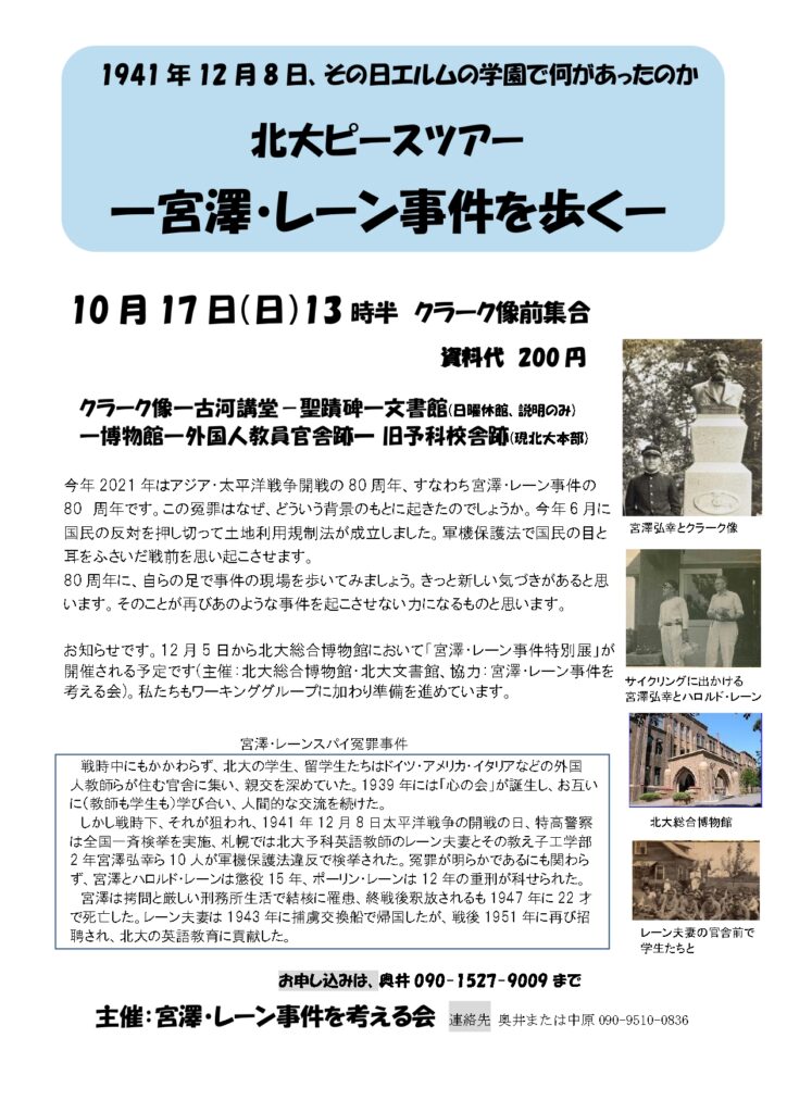 コロナ禍で思うような活動ができずにいましたが、宮澤・レーン事件から80年を迎える今年、北大総合博物館での宮澤・レーン事件の特別展が北大総合博物館と文書館の共催、宮沢・レーン事件を考える会協力で開かれることが決定し、秋の予定がコロナの緊急事態宣言で12月に延期にはなりましたが、開催されます。コロナ禍で決定が遅くなりましたが、例年開催してきた宮澤・レーン事件を歩く北大ピースツアーを行います。