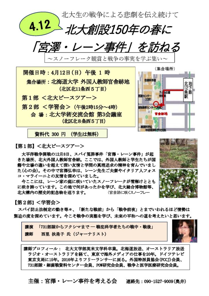 スパイ防止法に制定の動きはスパイ冤罪事件の悲劇、宮澤・レーン事件が再び、繰り返される危険があります。今こそ宮澤・レーン事件を考える会は北大の外国人官舎で起こった悲劇を伝え続けることの意義を参加者とともに考えたいと思います。